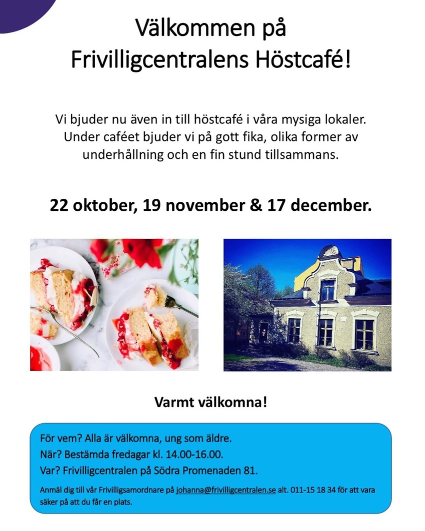 Vi bjuder ju då in till Höstcafe på Frivilligcentralen och kan redan nu lova både tårta, skratt och go gemenskap. Anmäl dig till johanna@frivilligcentralen.se så vi köper rätt antal tårtbitar!