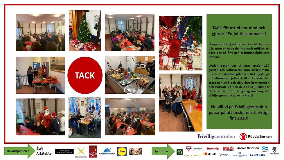 Stort tack till våra frivilliga som varit med och bidragit under dagen. Stort tack också till våra huvudsponsorer (ÅWL Arkitekter, Stjärnkliniken, Ljusare jul, Studio Gamla Stan, Lidl i Norrköping, Projektallians AB och Familjen Lundell) och sponsorer (Strömvillans Fritidsgård, CreVisa Utveckling, McDonald's Filmstaden, Empowra, Lagerhaus i Norrköping, Medley Centralbadet, Hemköp Kungsgatan, Studieförbundet Vuxenskolan, ICA Maxi Norrköping, SEHED och Aromadelfinen) som varit med och bidragit med julklappar och framförallt stort tack till våra gäster som kom och ville fira med oss.