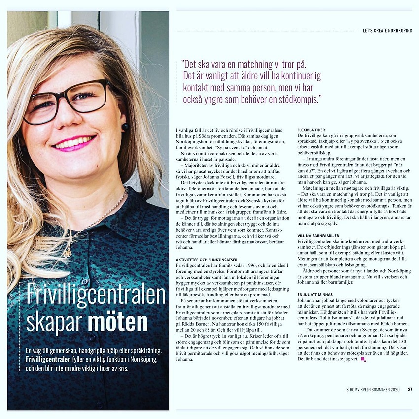 I förra veckan kom ett nytt nummer av Strömvirveln ut (kommunens tidning till personal och förtroendevalda). I detta nummer fick vi vara med och berätta om Frivilligcentralen och det arbete som görs. Så roligt att de vill uppmärksamma oss. Tänk vad mycket fint vi gör tillsammans!