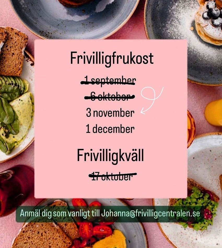 Anmäl dig till johanna@frivilligcentralen.se så vi vet hur mycket frukost vi ska köpa. Hoppas att vi ses!