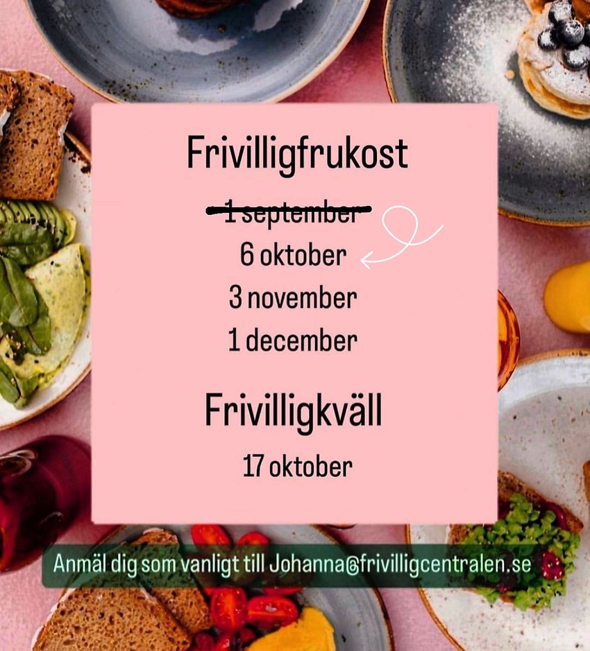 Även denna höst bjuder vi in till Frivilligfrukost och fika och nu på fredag alltså den 6/10 är det dags igen och du som är frivillig är varmt välkommen. En chans att träffa andra frivilliga, byta erfarenheter och samtidigt äta en riktigt mumsig frukost/fika. Anmäl dig till johanna@frivilligcentralen.se så vi vet hur mycket frukost vi ska köpa. Hoppas att vi ses!