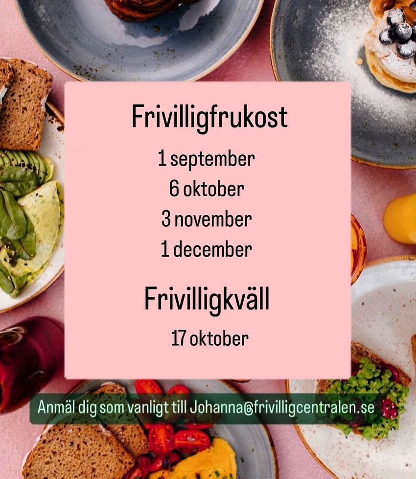 Även denna höst bjuder vi in till Frivilligfrukost och fika! En chans att träffa andra frivilliga, byta erfarenheter och samtidigt äta en riktigt mumsig frukost/fika.