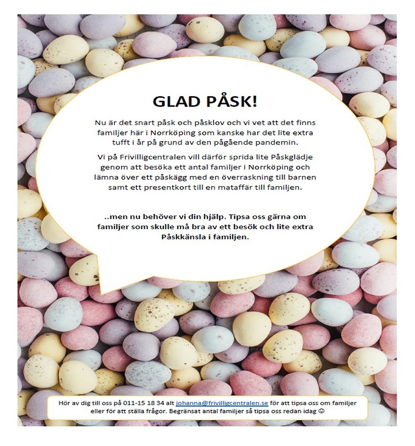 Nu är det snart påsk och påsklov och vi vet att det finns familjer här i Norrköping som kanske har det lite extra tufft i år på grund av den pågående pandemin.