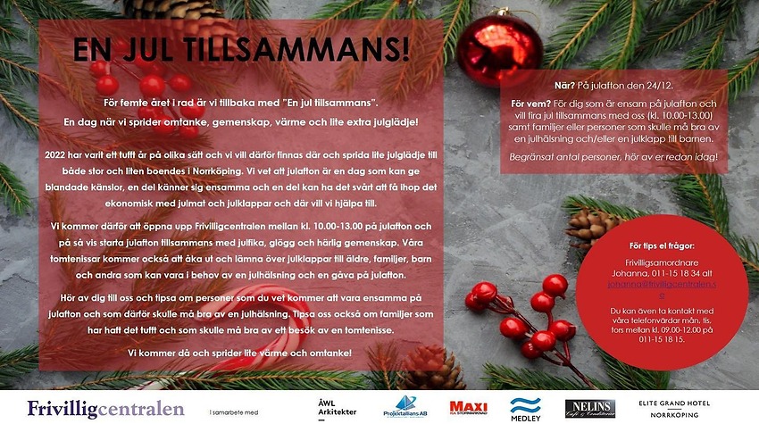 Vi kommer också att hålla Frivilligcentralen öppen på julafton mellan kl. 10.00-13.00 så då är du som är ensam på julafton välkommen att fira tillsammans med oss. Vi bjuder på lite julfika och mysig stund tillsammans!