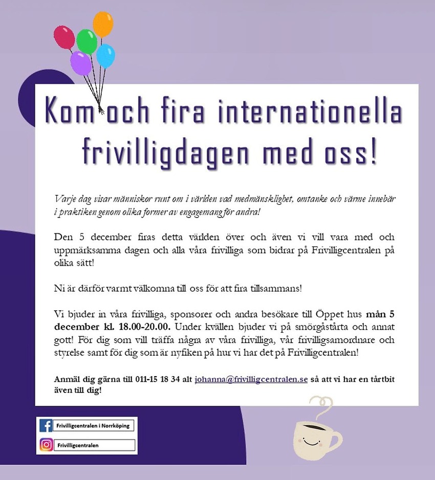Ni är därför varmt välkomna till Frivilligcentralen för att fira tillsammans!