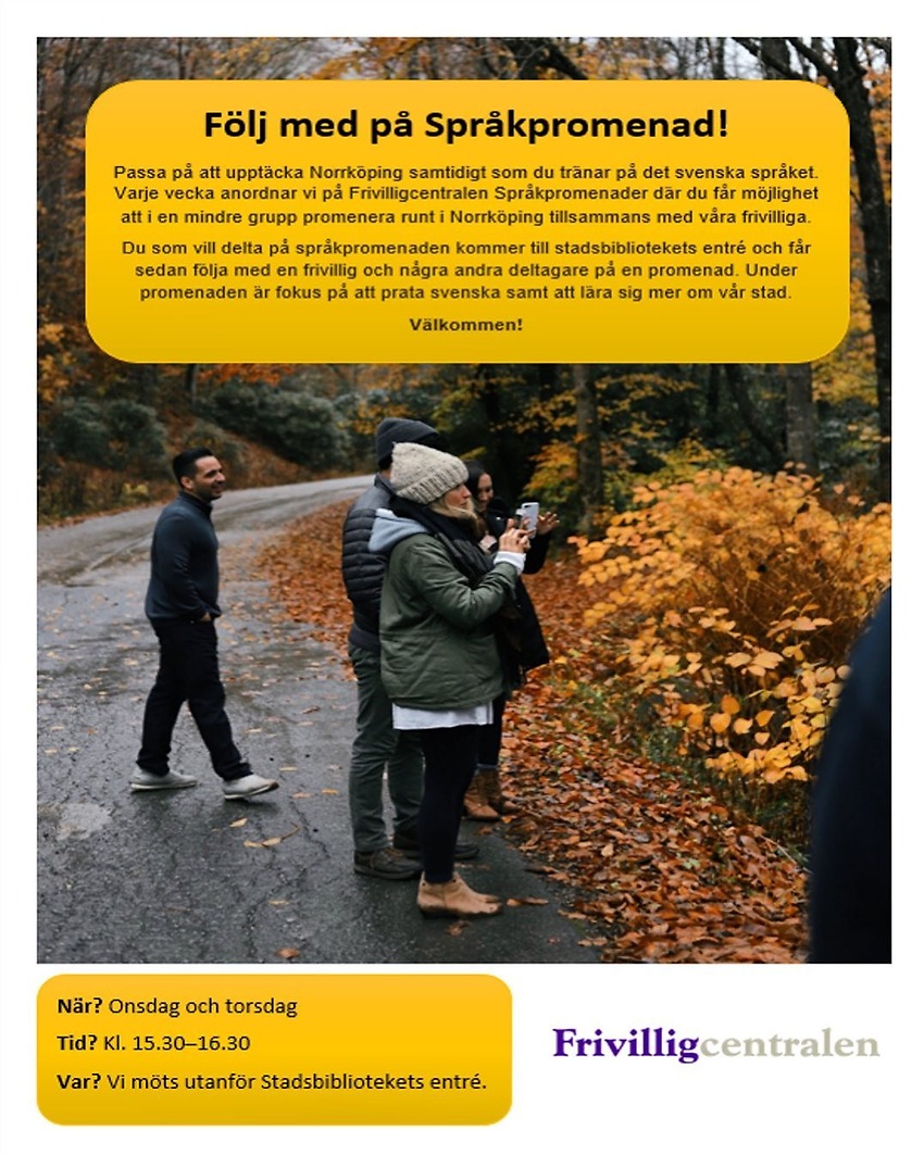 I veckan drar vi igång med våra språkpromenader igen! Passa på att upptäcka Norrköping samtidigt som du tränar på din svenska. Våra frivilliga väntar på att just du ska komma! Ett bra sätt att komma ut och möta andra men på ett tryggt och ansvarsfullt sätt!