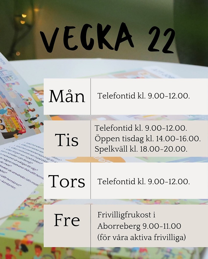 - Spelkväll & prat, tisdag kl. 18.00-20.00. För dig som önskar en mötesplats där fokus är spel, skratt, gemenskap eller att bara vara.