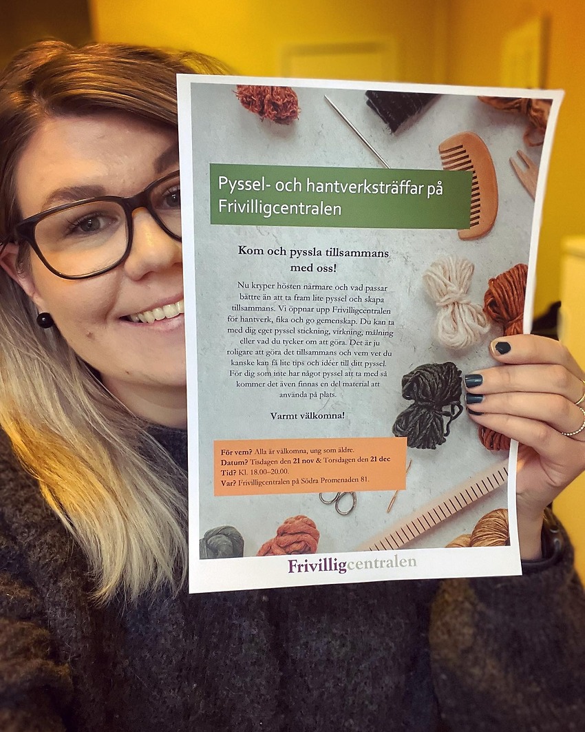 Hörreni nu har vi nya roligheter på gång här på Frivilligcentralen. Nu i november drar vi nämligen igång våra pyssel- och hantverksträffar med start tis den 21 nov kl. 18.00-20.00. Nu när höstmörkret kryper närmare så passar det ju väldigt bra att ta fram lite pyssel och skapa tillsammans. Antingen tar du med ditt eget hantverk stickning, virkning, målning el det du tycker om att göra. Det är ju roligare att göra det tillsammans och vem vet du kanske kan få lite tips och idéer till ditt pyssel. Vi kommer även att ha en del material på plats som du gärna får pyssla med. Kom och skapa tillsammans med oss!