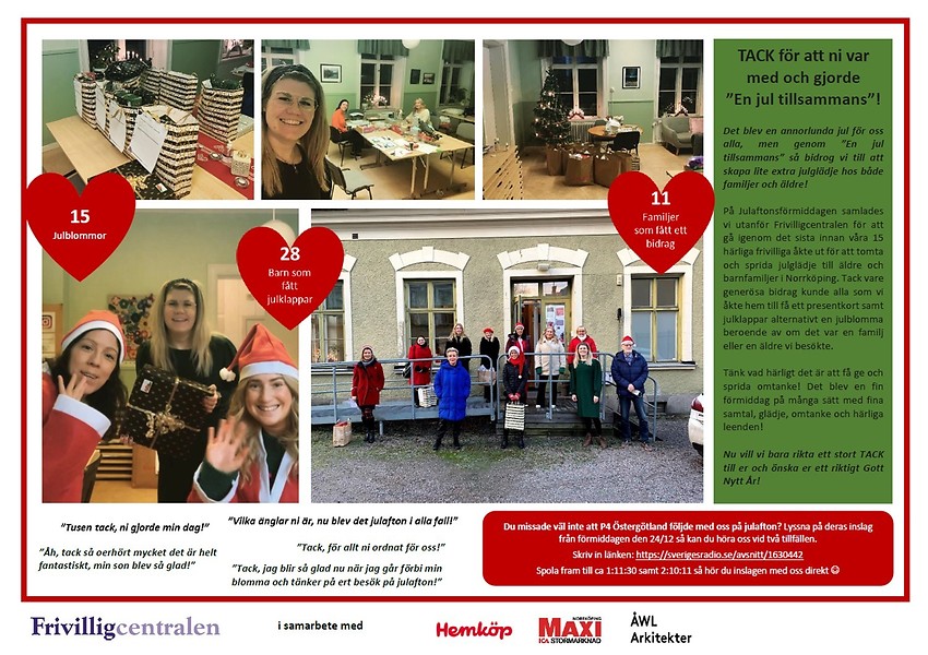Stort tack till er som var med och bidrog på julafton som frivillig eller som företag ÅWL Arkitekter, ICA Maxi Norrköping samt Hemköp i Söderköping. Det är tillsammans som vi gör skillnad!