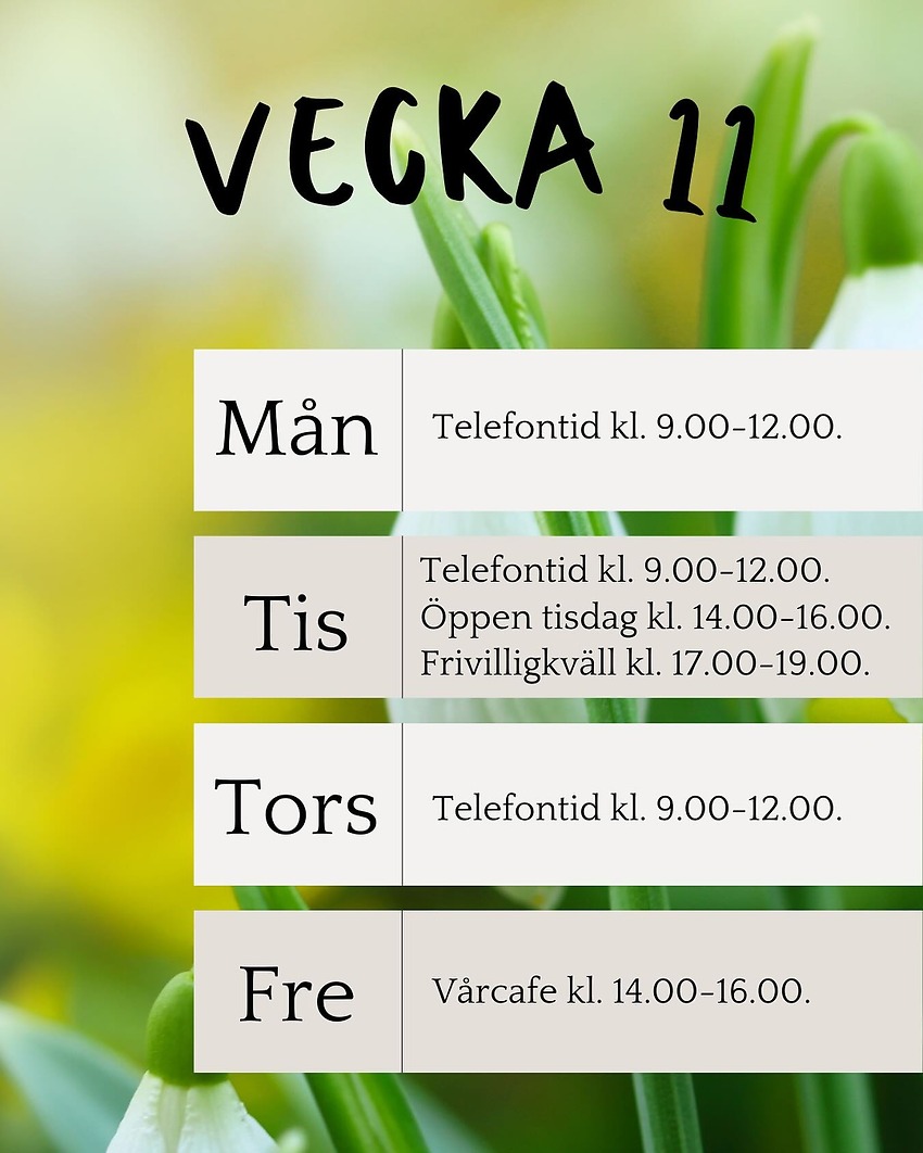- Öppen tisdag kl. 14.00-16.00. Kom förbi och ta en kaffe, ställ en fråga eller småprata lite med oss.