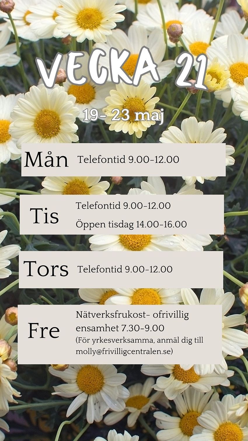 - Nätverksfrukost - tema ofrivillig ensamhet, fredag kl. 7.30-9.00. För dig som är yrkesverksam och arbetar med frågor kopplat till ofrivillig ensamhet. För mer info el anmälan, hör av dig till Molly@frivilligcentralen.se
