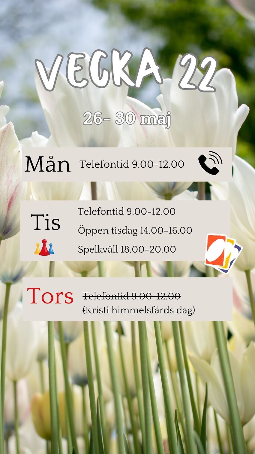 - Spelkväll & prat, tisdag kl. 18.00-20.00. För dig som önskar en mötesplats där fokus är spel, skratt, gemenskap eller att bara vara.