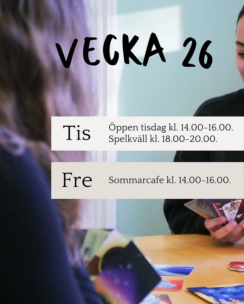 - Spelkväll & prat, tisdag kl. 18.00-20.00. För dig som önskar en mötesplats där fokus är spel, skratt, gemenskap eller att bara vara.