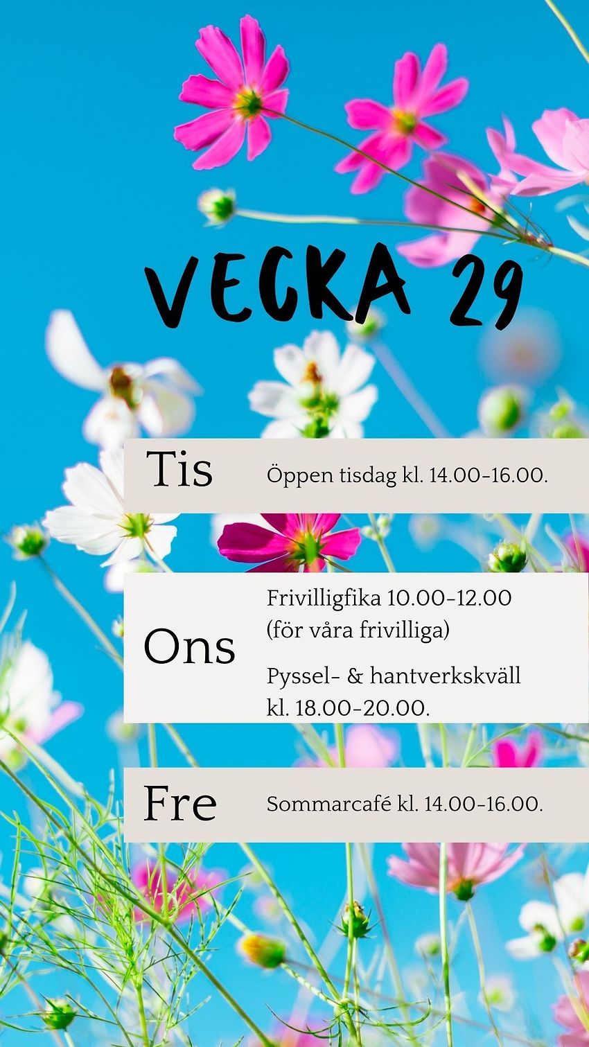 - Pyssel- & hantverkskväll onsdag kl. 18.00-20.00. Kom och pyssla med oss. Ta med ditt eget hantverk, stickning, virkning, målning eller vad du tycker om att göra. För dig som inte har något pyssel att ta med så finns det även material att använda på plats. Det blir en kväll med hantverk, fika och go gemenskap.