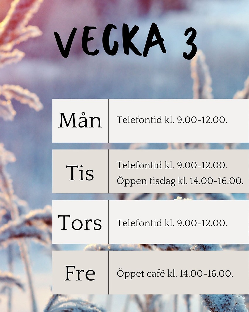 - Öppen tisdag kl. 14.00-16.00. Kom förbi och ta en kaffe, ställ en fråga eller småprata lite med oss.