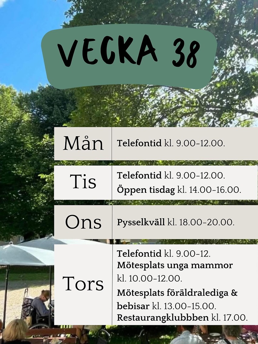 - Mötesplats för unga mammor, tors kl. 10.00-12.00. För dig som är en ung mamma och vill träffa jämnåriga mammor och barn och ha en trevlig stund tillsammans.