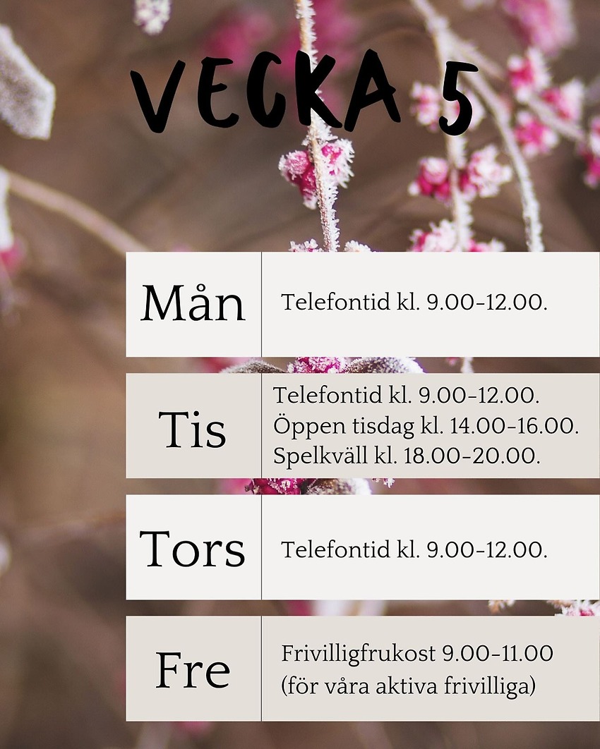 - Spelkväll & prat, tisdag kl. 18.00-20.00. För dig som önskar en mötesplats där fokus är spel, skratt, gemenskap eller att bara vara.