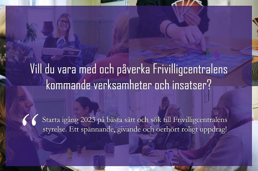 Starta igång 2023 på bästa sätt och sök till Frivilligcentralens styrelse. Ett spännande, givande och oerhört roligt uppdrag där du får möjlighet att påverka vilka verksamheter och insatser som ska genomföras i år!