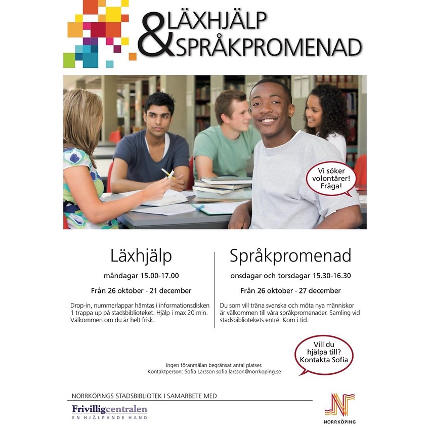 Läxhjälpen kan du nu besöka igen på måndagar mellan kl. 15.00-17.00 på stadsbiblioteket. Det är drop-in, men se till att vara där i tid så att du hinner få en nummerlapp och på så vis hjälp av en av våra frivilliga.